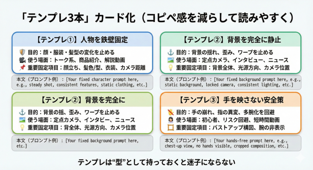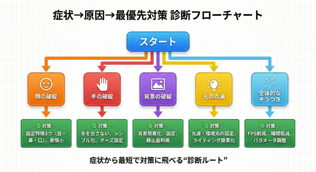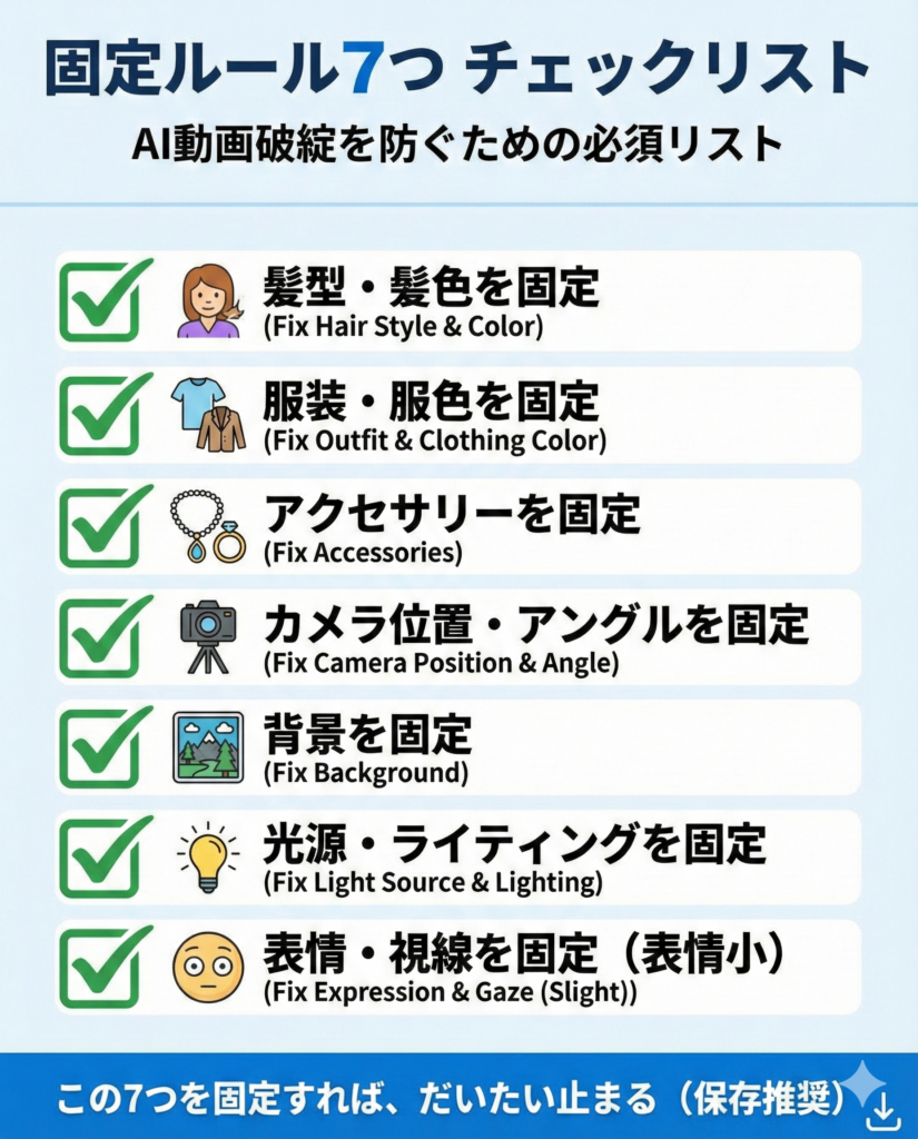| 顔が別人化 | 固定要素不足/顔の露出が多い/表情変化が大きい | 固定特徴を3つ入れる/表情は小さく/カメラ固定 |