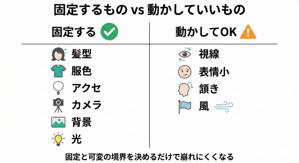 この「固定:可変」の境界が曖昧なとき、顔・手・背景は高確率で崩れます。