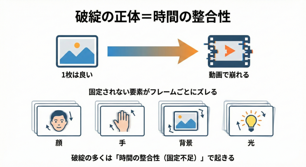 「1枚は良いのに、時間(連続フレーム)でつながらない」=時間の整合性が崩れている