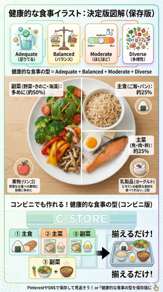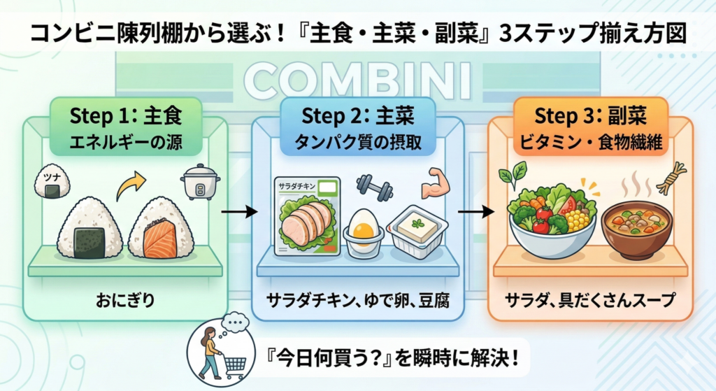 この図を覚えるだけで、コンビニでも外食でも「何を足せば整うか」が見えてきます。