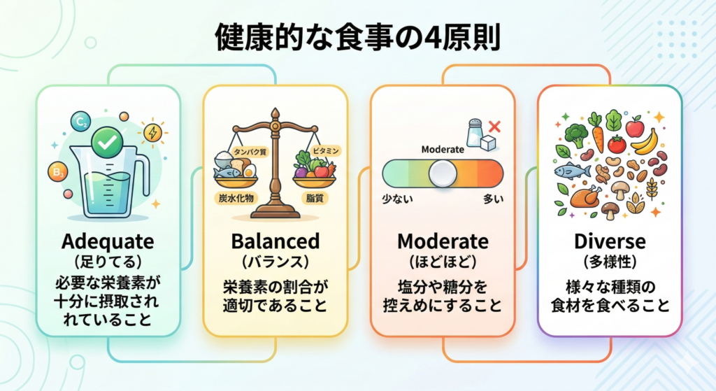 WHO(世界保健機関)は「Healthy diet」を説明する中で、必要量を満たす(Adequate)、バランス(Balanced)、摂りすぎない(Moderate)、多様性(Diverse)といった考え方で整理しています。