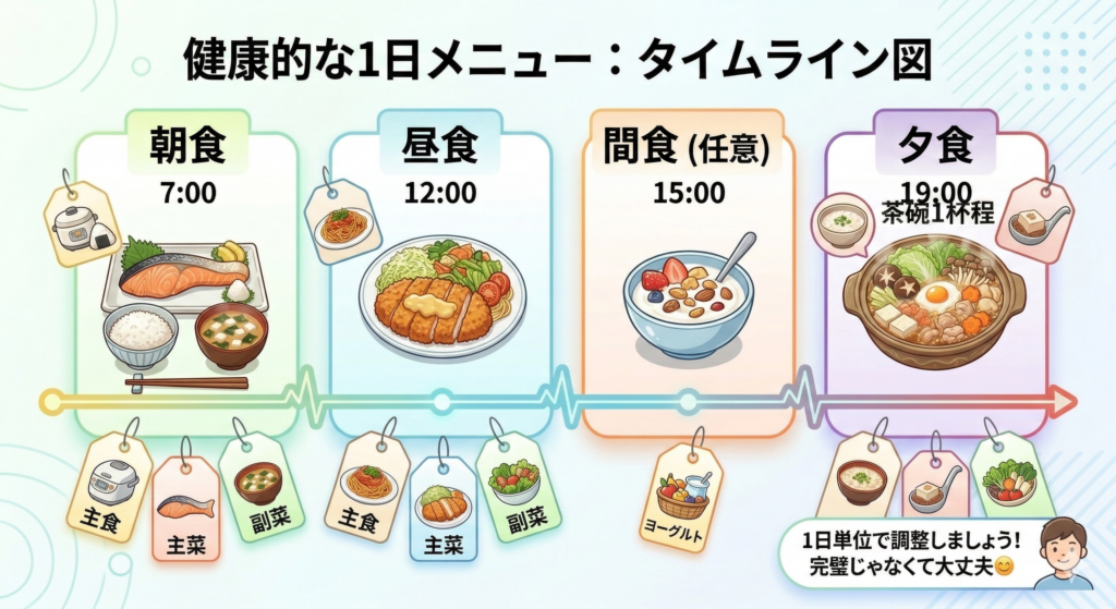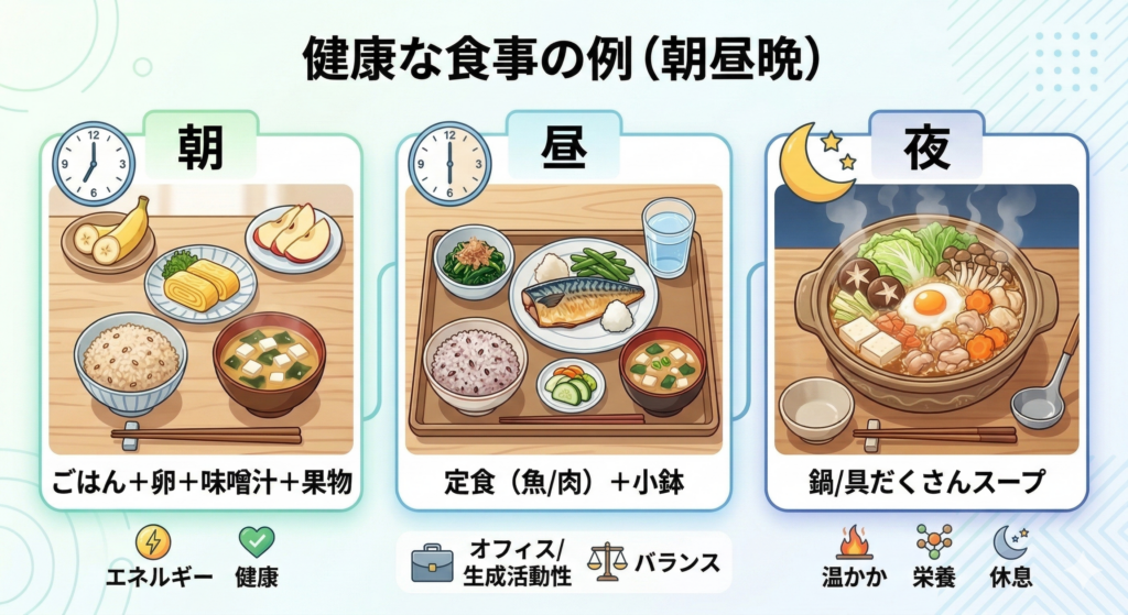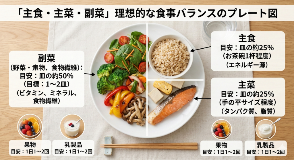 主食・主菜・副菜を揃えるだけで、健康的な食事は成立しやすくなります。