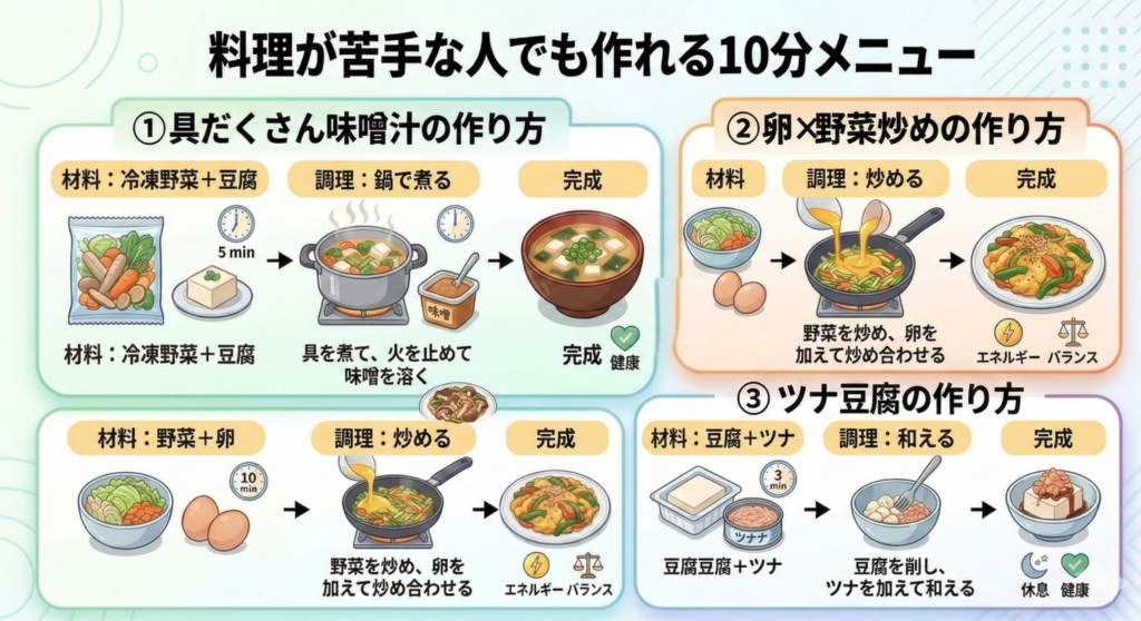 | 料理したくない | 具だくさんスープ(冷凍野菜でもOK)+おにぎり+豆腐 | 副菜がスープで稼げる。主食・主菜も足せる |
