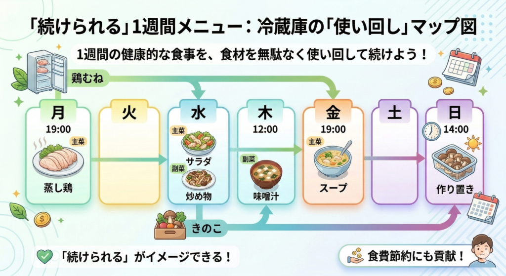 A. 同じ食材を使い回すことです。副菜はスープや味噌汁で“まとめて確保”すると続きます。完璧な献立より、戻れる献立が強いです。