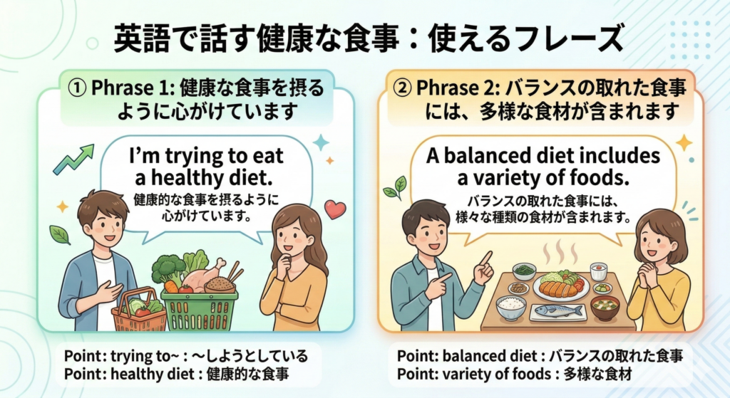 - 健康的な食事の英語と、覚えやすい例文