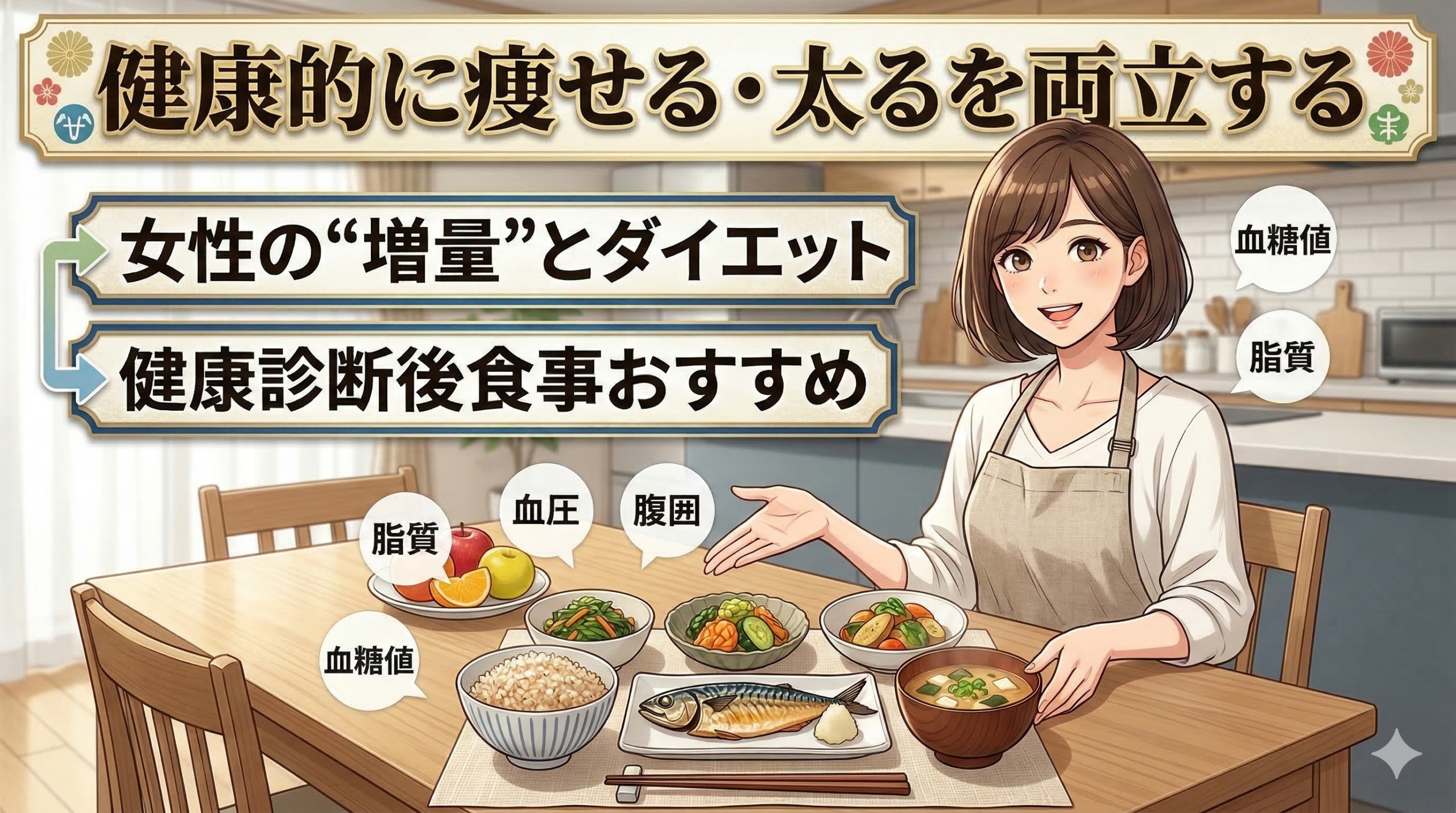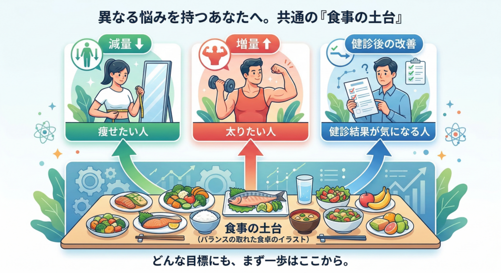 この記事では、減量・増量・健診後の食事を一本にまとめて、あなたに必要な整え方が分かるように整理していきます。
