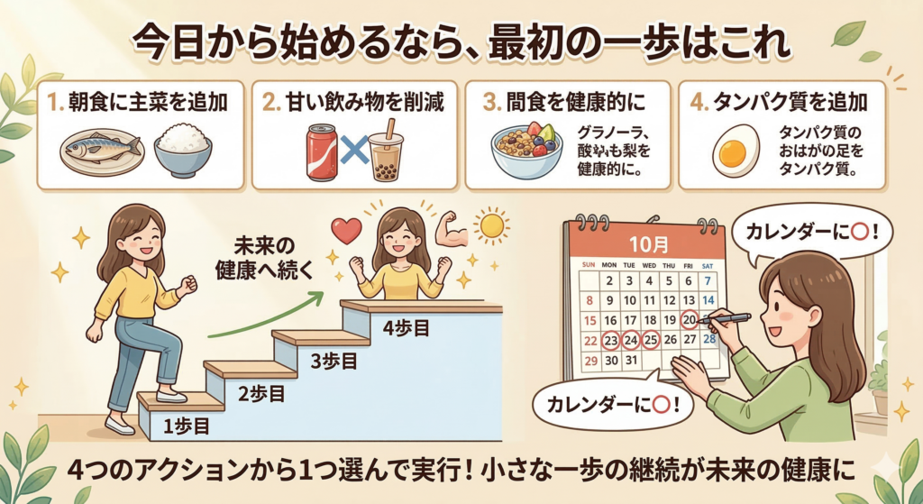 体は、急な改革より、静かな継続に強く反応します。未来の自分を助けるのは、完璧な1週間ではなく、今日の1食です。