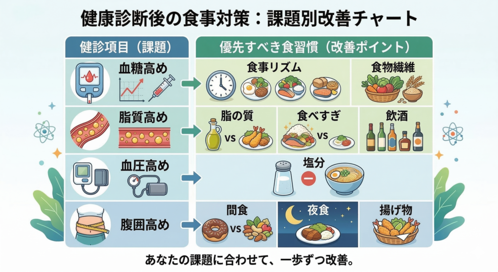 血糖なら食事リズム、血圧なら塩分、脂質なら脂の質や食べすぎ、腹囲なら間食や飲酒の見直しが優先です。