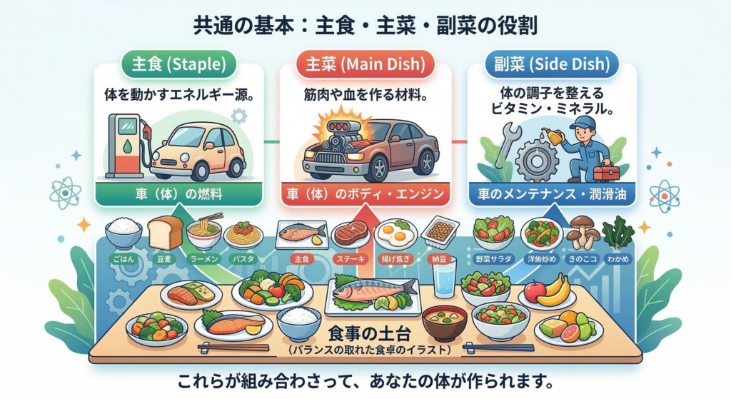 健康的な食事 ダイエットでも、健康に太る食事でも、共通の基本は「主食・主菜・副菜」です。