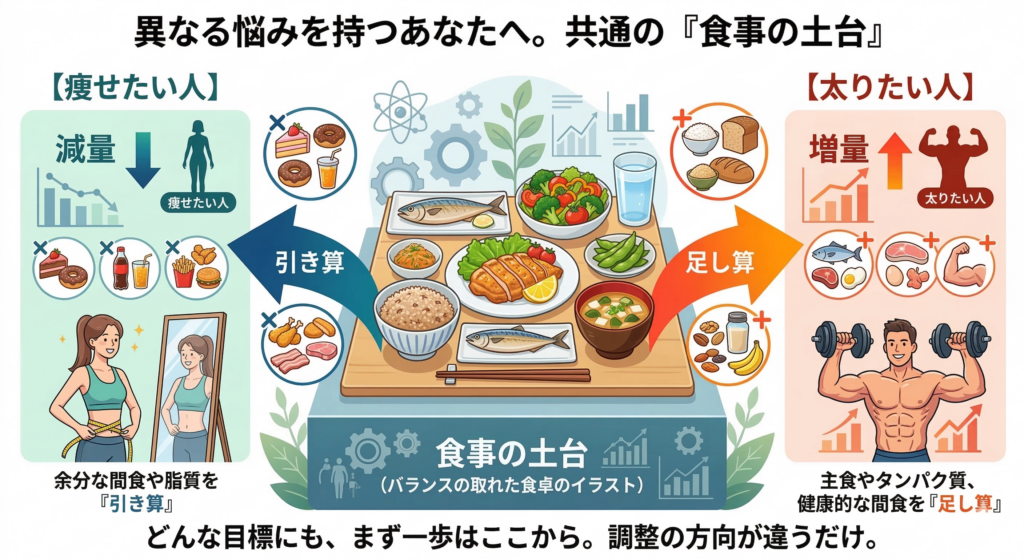 痩せるか、太るか。数字だけ見れば逆方向でも、健康的な体重調整の土台は同じです。