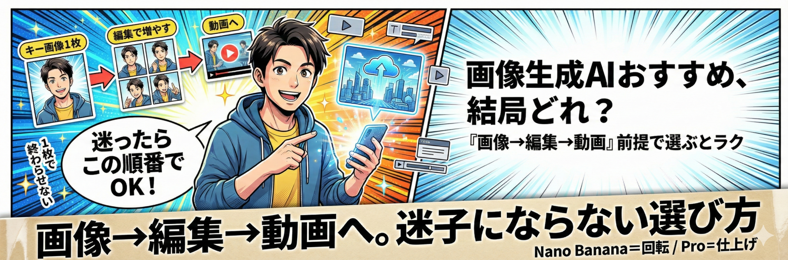 - GeminiはNano Banana(回転)/Nano Banana Pro(仕上げ)で使い分けると効率が良い