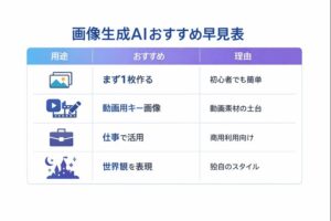 | ジャンル / 目的 | 向きやすい画像生成AI | 理由(動画前提) | 最初の一手 |