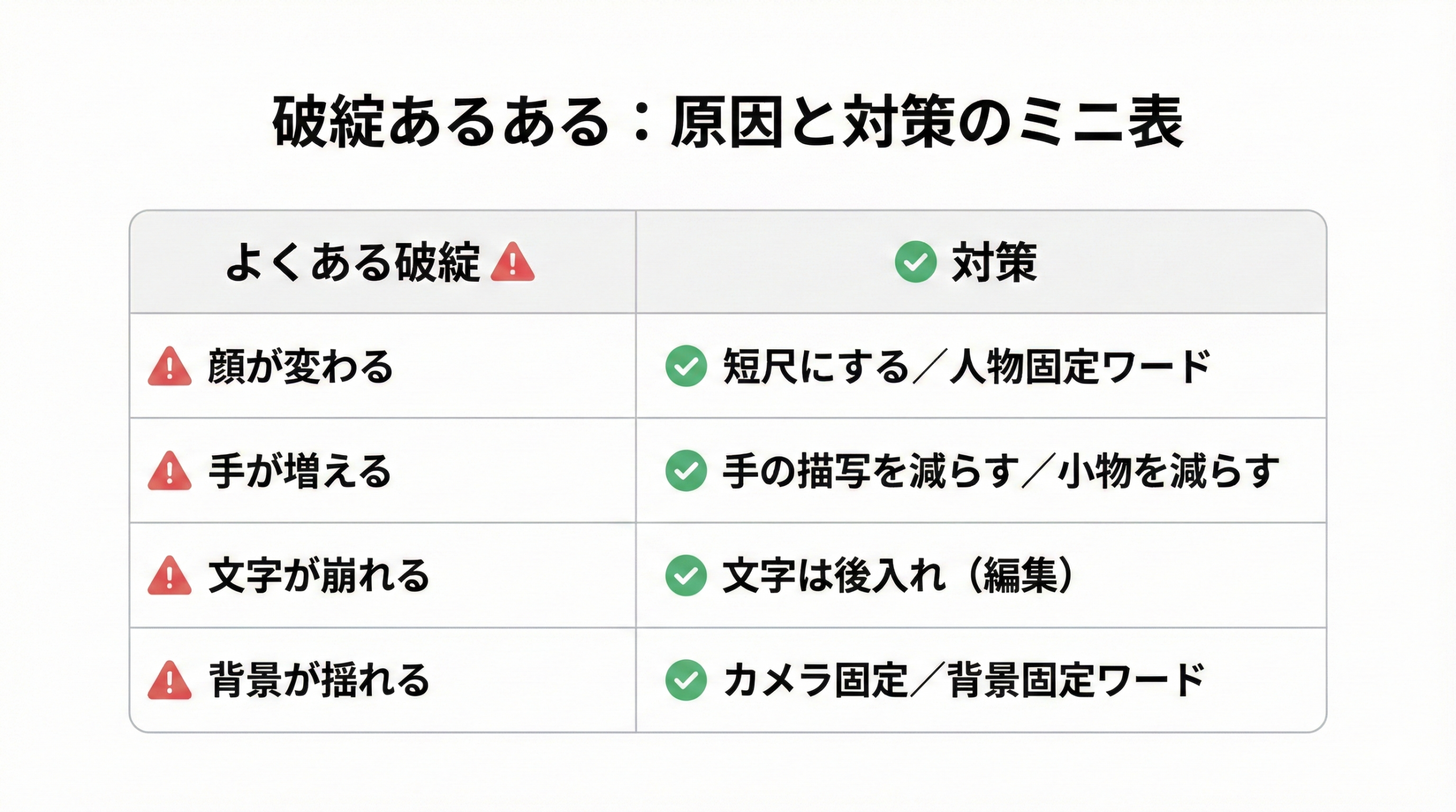 画像→動画で「顔が別人」「手が増える」「背景がワープ」する原因は“時間の整合性”。固定ルール7つとチェックリスト12項目、コピペ用テンプレ3本で一気に解決。